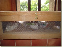 This was our abundant cheese board at lunch today at MD’s. The Le Mothais goat cheese wrapped in chestnut tree leaves was remarkable for its flavor and my favorite. When finished, we set the whole cheese board in a small garde-manger used as a garde-fromages where it fits perfectly. The cheeses are kept in a cool pantry by an open window, not in the refrigerator, so that they are ready to eat and not too cold to taste.